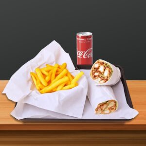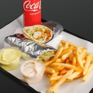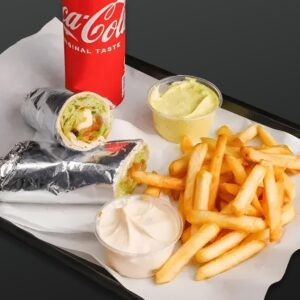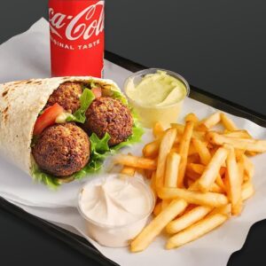 • 1 Falafel Wrap • Pommes frites • 1 alkoholfreies Getränk 0,33l nach Wahl
