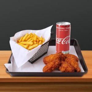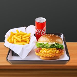 mit crispy chicken , cheese macaroni, pommes und ein alkoholfrei getränk 0.33l