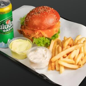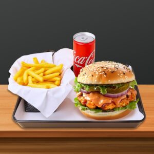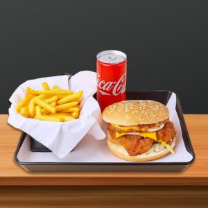 • 1 Crispy Chicken Burger • Pommes frites • 1 alkoholfreies Getränk 0,33l nach Wahl