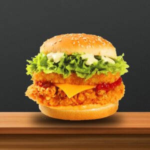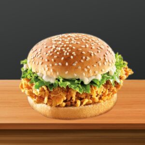 burger mit crispy chicken ,curry sauce, ananas Pommes frites 1 alkoholfreies Getränk 0,33l nach Wahl